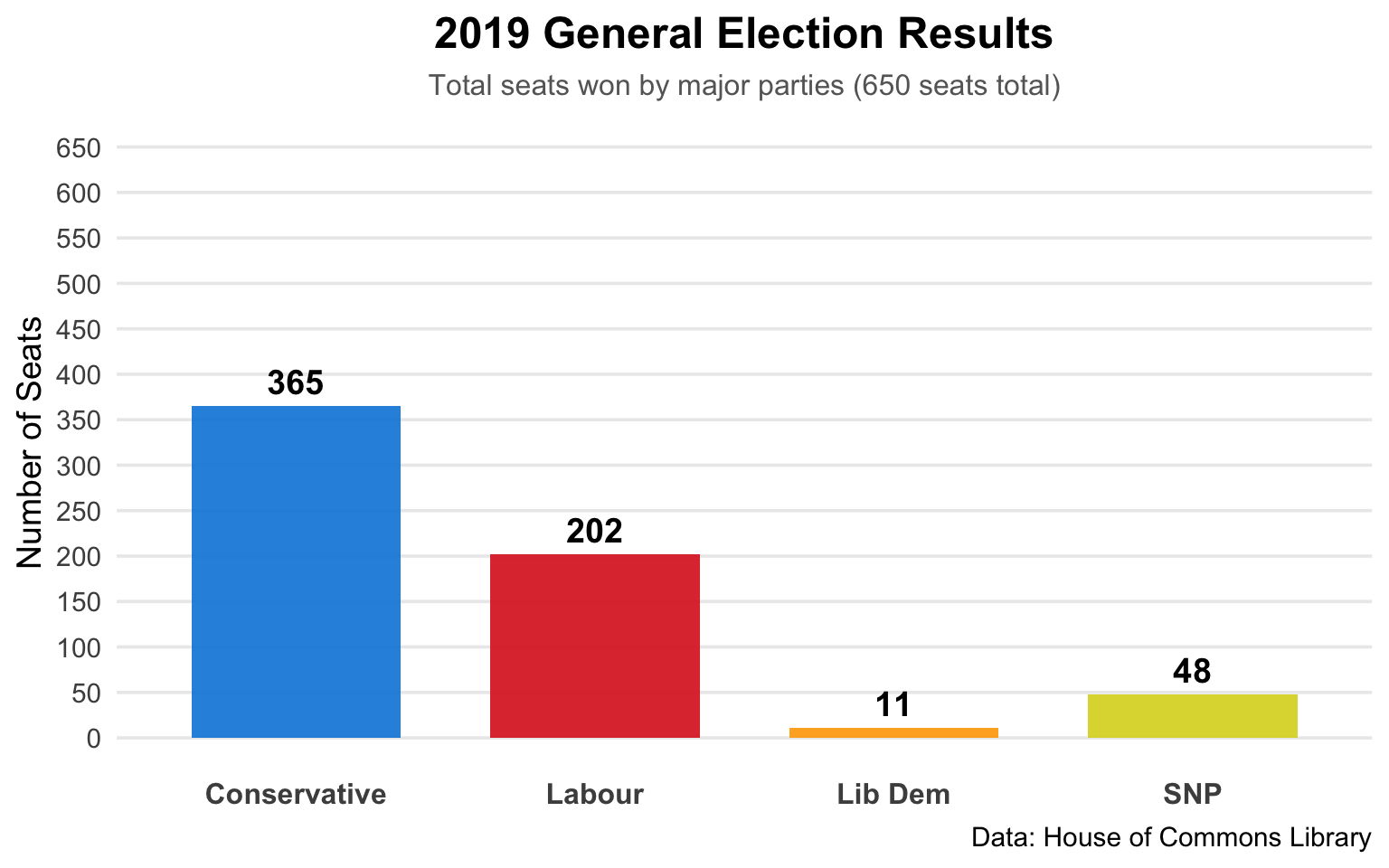 subtitle = "Total seats won by major parties (650 seats total)",