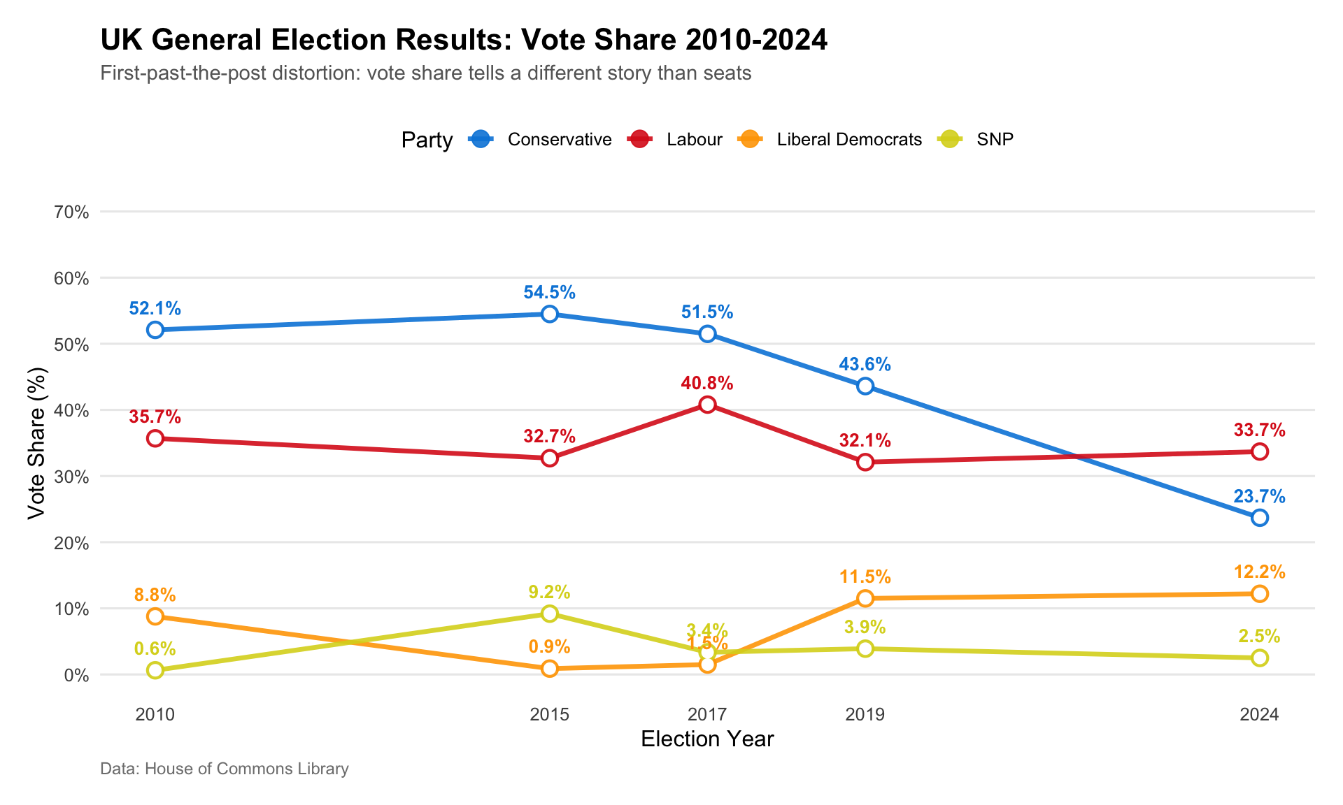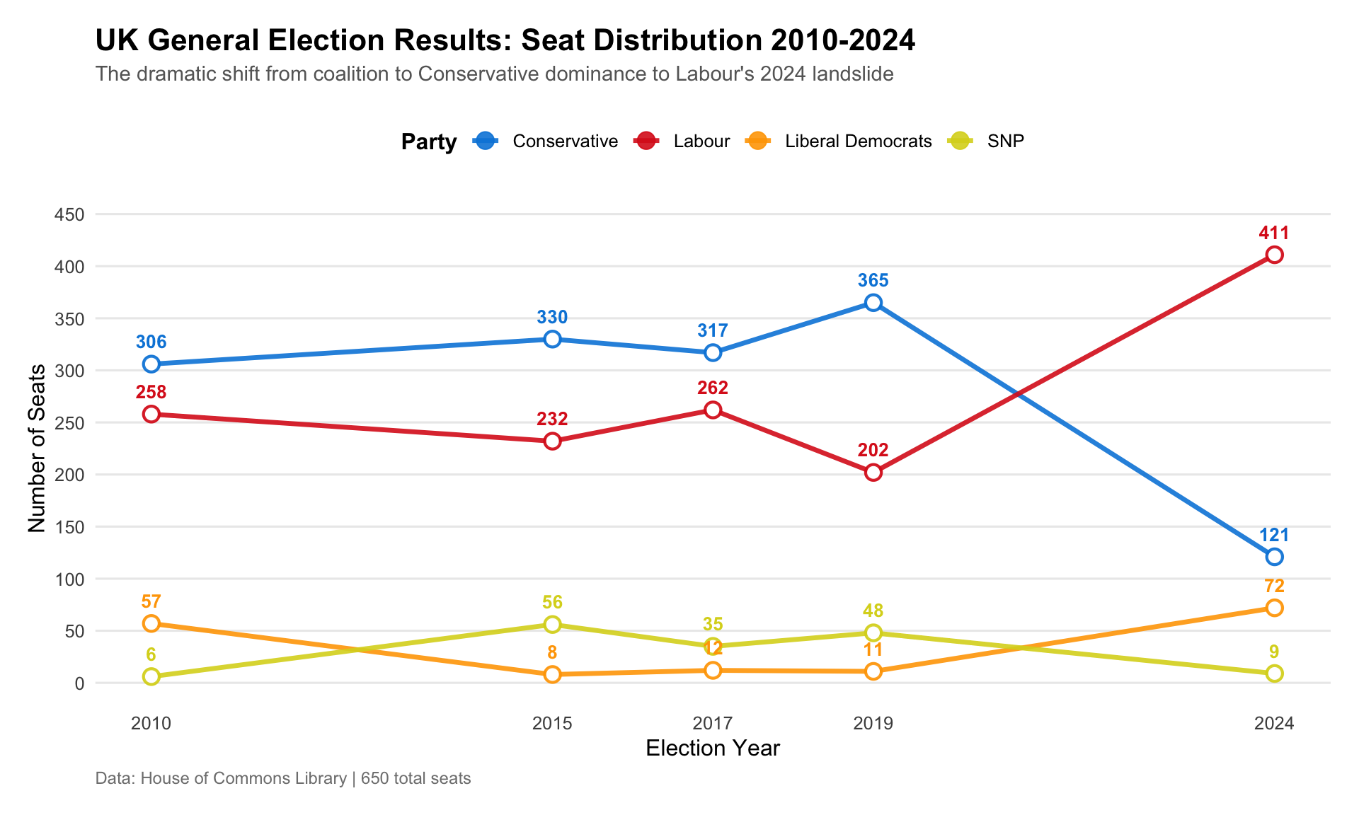 title = "UK General Election Results: Seat Distribution 2010-2024",